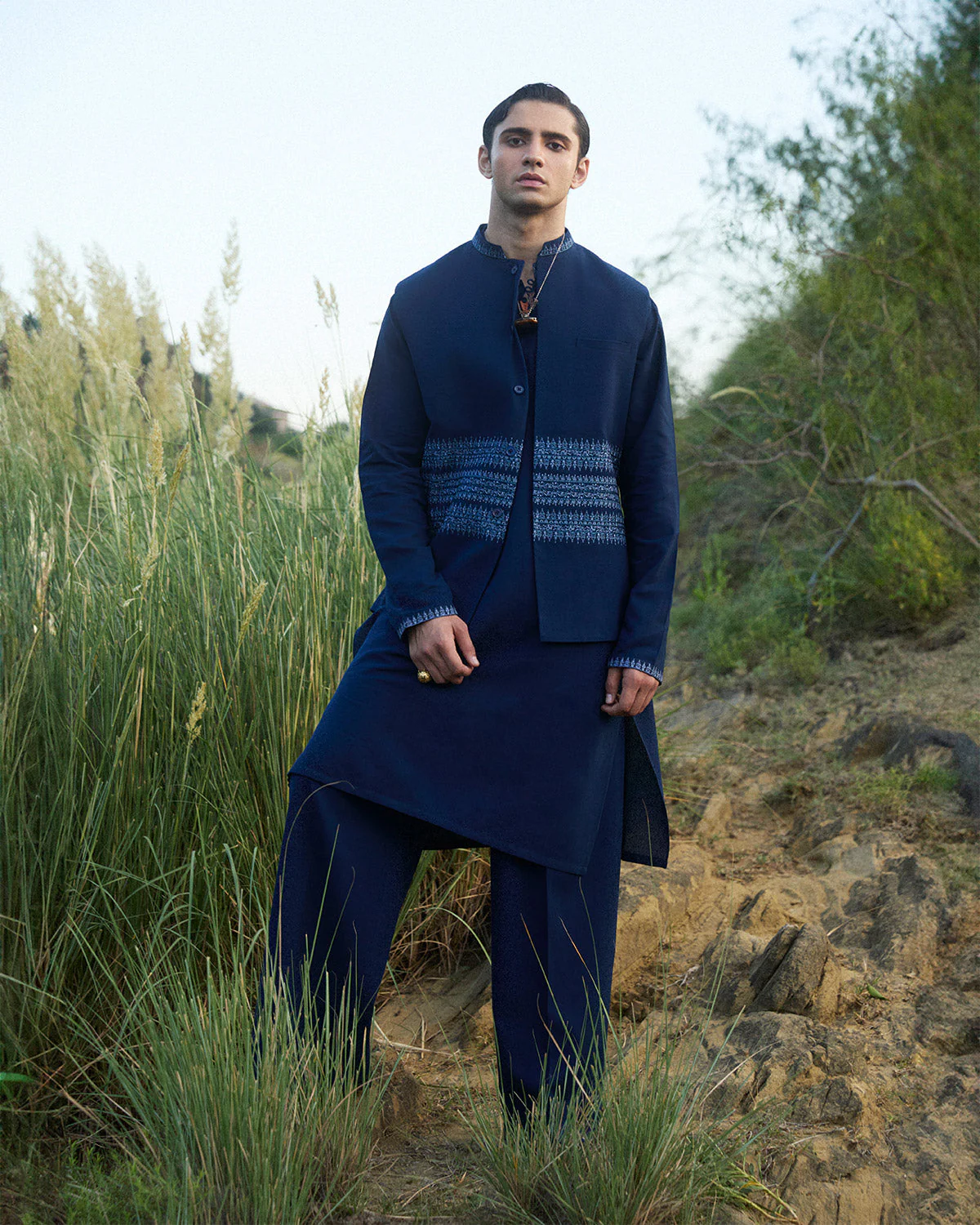 Description: This stylish blue outfit brings subtle elegance with its monochrome detailing and classic design. The shirt features delicate fabric buttons along the neckline, paired with monochrome embroidery on the collar and sleeves for a touch of sophistication. The loose-fit blue trousers provide a comfortable, relaxed silhouette, making this ensemble perfect for all-day wear. Completing the look is a blue waistcoat with matching monochrome embroidery, adding depth and refinement to the outfit. With a balance of minimalism and elegance, this ensemble is ideal for those seeking effortless style with a polished edge.