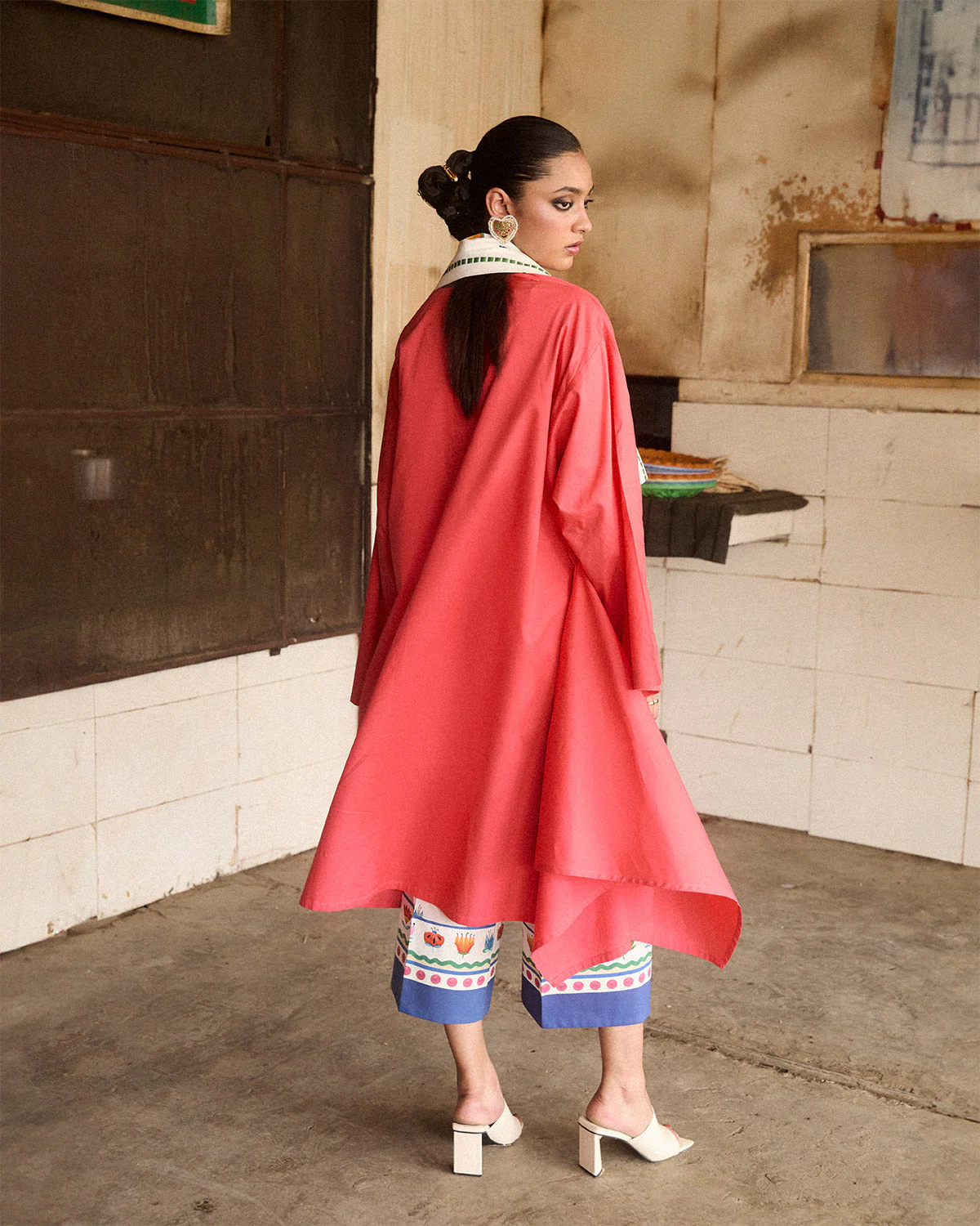 Description: Make a striking impression with this vibrant coral ensemble. The shirt features a unique design with fabric cascades elegantly draped on the sides, adding a dynamic flow to the garment. The button loop neckline and front center slit provide a touch of sophistication and ease, enhancing the shirt's modern aesthetic. It is paired with ivory printed culottes, which offer a subtle contrast with their navy blue color-blocked hem, creating a balanced and stylish look. This combination of bright coral with classic ivory and navy details results in an ensemble that is both eye-catching and refined, perfect for a range of occasions..