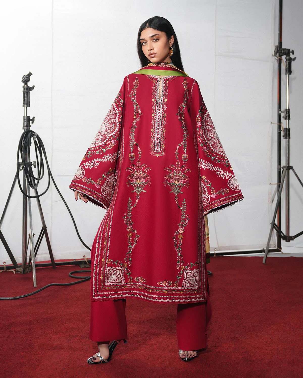 A classic red long shirt adorned with multicolor floral embroidery is paired with beautifully detailed bell sleeves, featuring monochrome embroidered organza patches for an added touch of refinement. The look is completed with a red, dyed pleated trouser that adds structure and flow, while a digital printed silk dupatta brings in a soft contrast and elevates the ensemble with a contemporary finish.