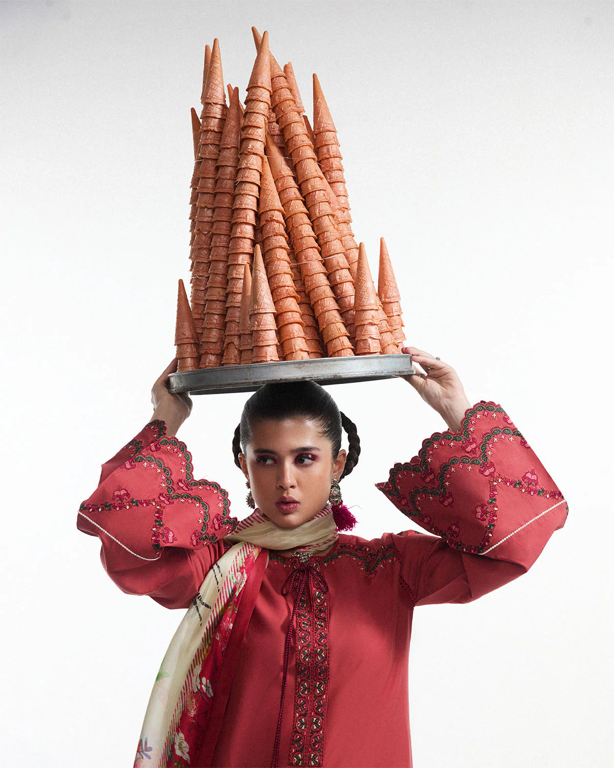 Description: The digitally printed silk scarf adds a touch of elegance and charm to the ensemble. Featuring delicate floral motifs in soft, vibrant hues and finished with tassels, it beautifully complements the rich red tones of the outfit. Crafted from fine silk, the scarf drapes gracefully, blending traditional design with a refined, modern finish.