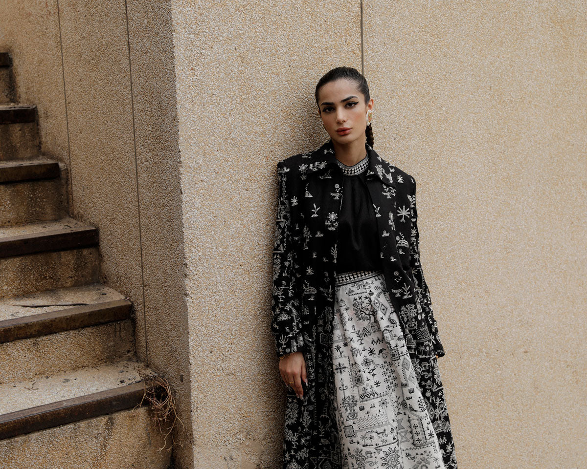 In this fashionable ensemble, you'll find a black halter sleeveless top with embroidered patti on the neck and around the armholes, paired with an ivory A-line box-pleated skirt featuring black embroidery and an embroidered belt. Complete your look with a tailored trench coat in black with intricate ivory embroidery. Achieve an effortlessly stylish and elegant appearance.