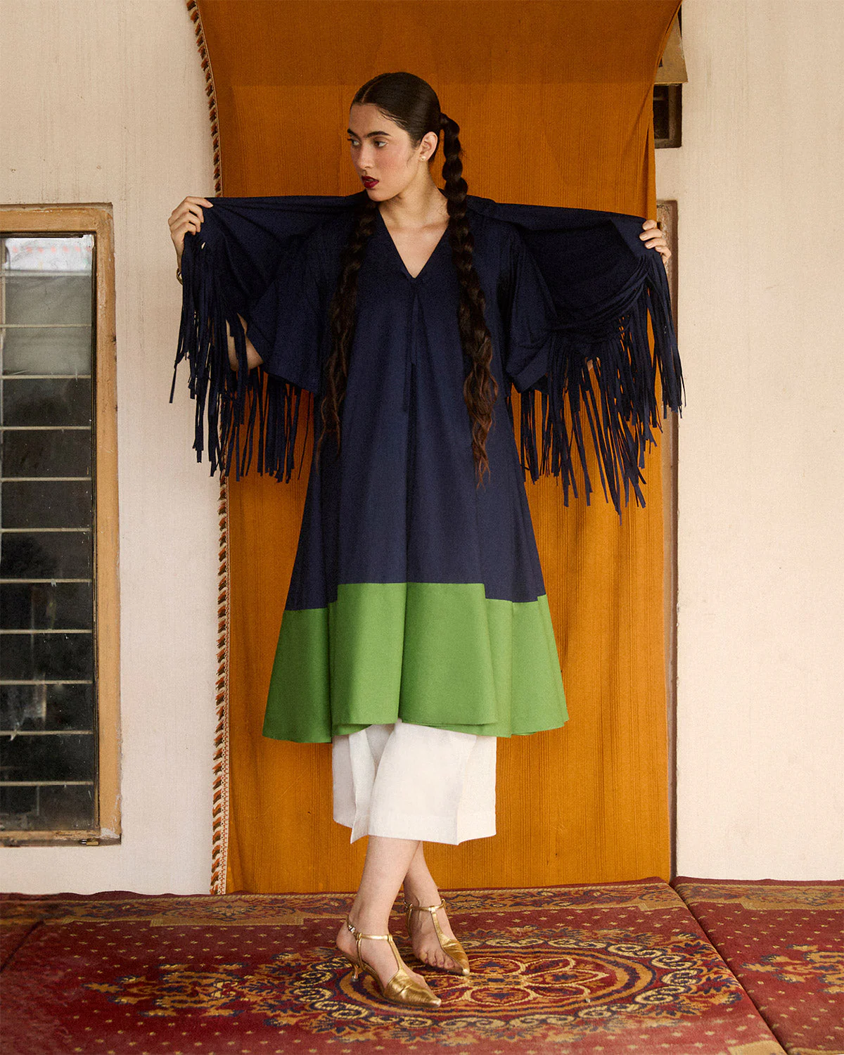 Description: Elevate your style with this stunning ensemble featuring a royal blue A-line shirt and matching culottes. The shirt is designed with a chic flared cut that offers a graceful silhouette, while the vibrant royal blue fabric exudes elegance and sophistication. The shirt’s highlight is its apple green color-blocked hem panel, adding a bold pop of color that creates a striking contrast. The V-shaped neckline is adorned with a delicate bow tie detail, lending a touch of feminine charm and refinement. Paired with the ivory culottes, this outfit provides a seamless and polished look that’s perfect for both formal events and fashionable outings.