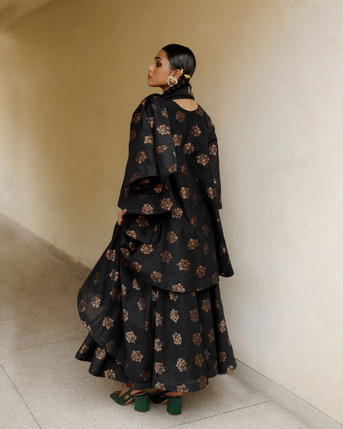 Complete your look with a classy ensemble featuring a Kimono Sleeves A-line shirt with lining, a flared skirt, and a coordinating scarf. All three pieces are crafted from black cotton with elegant Zari accents, ensuring you look effortlessly stylish