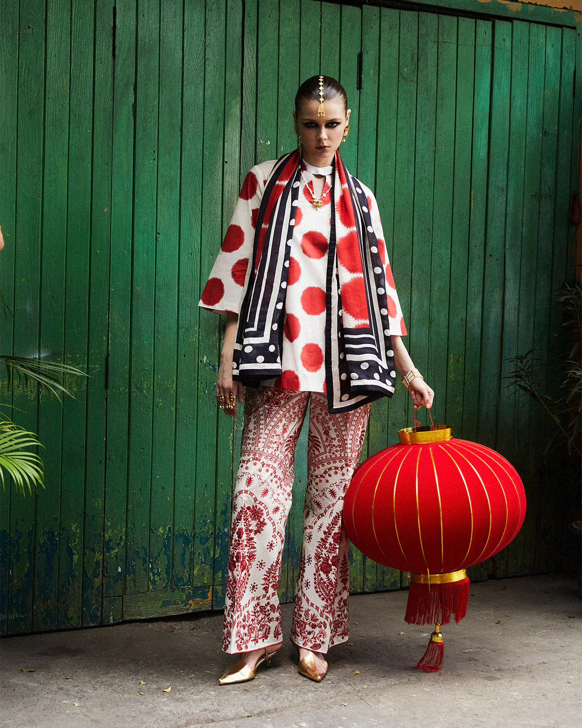 Product Description: An elegant pairing of an ivory cotton shirt and embroidered pants. The shirt features an inky dot print in red. Paired with matching ivory cotton pants adorned with delicate red embroidery and printed silk scarf, this ensemble exudes sophistication and style.