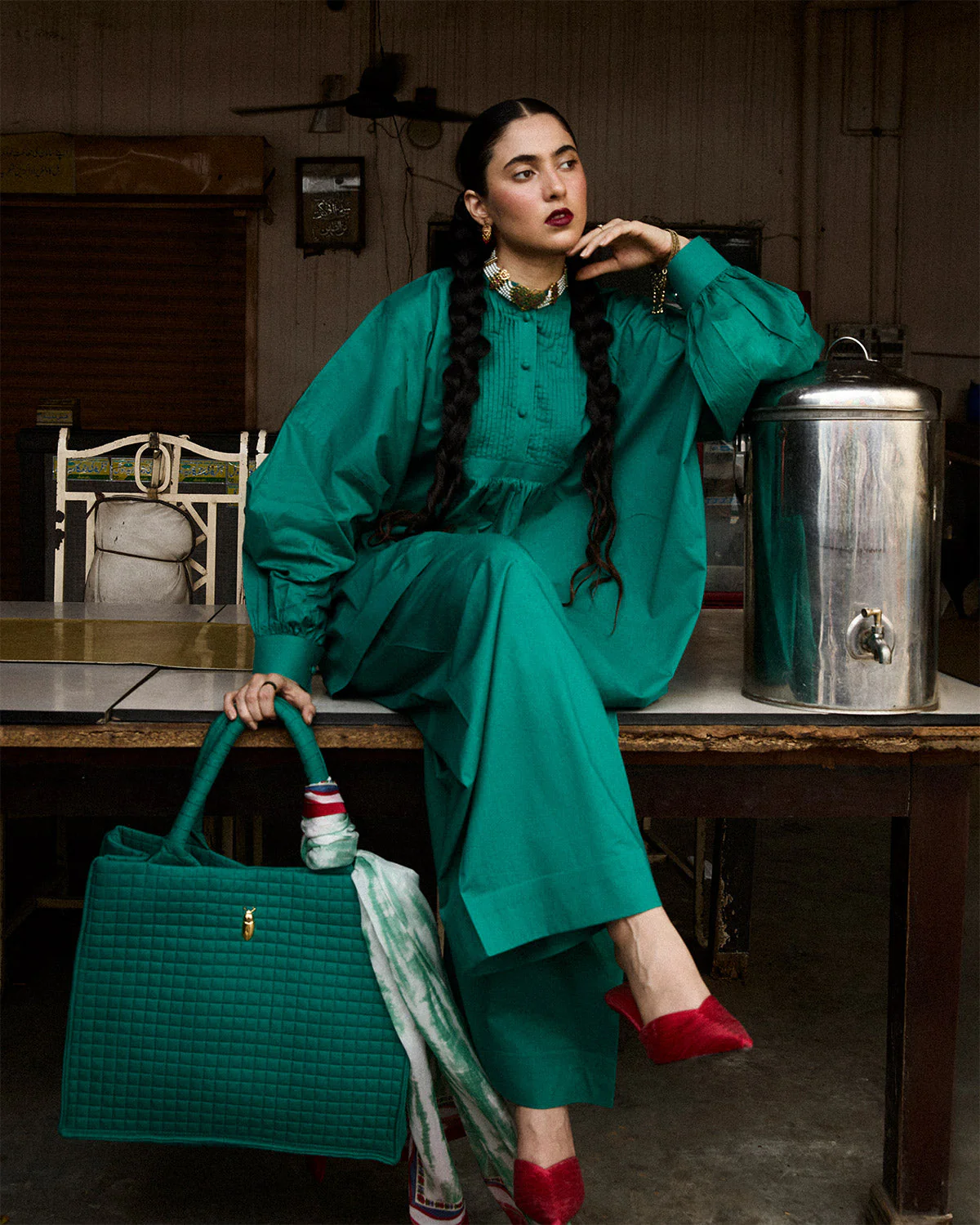 Description: This teal coord set features a stylish short-length shirt with a pleated neckline, adding a touch of sophistication. The shirt is designed with a collar band and a placket, creating a classic, refined look. Gathers at the center enhance the shirt’s silhouette, introducing a breezy, flowing element that keeps the outfit cool and comfortable. It is paired with a flapper shalwar, which complements the shirt’s relaxed vibe with its elegant, wide-leg design. The ensemble combines contemporary details with a fluid, effortless style, making it both chic and easy to wear.