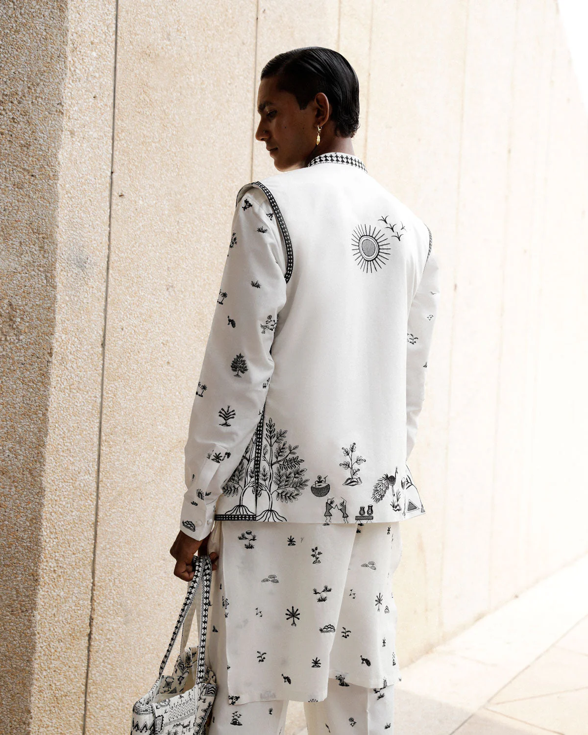 Experience sophistication with our Signature Embroidered kurta and straight pants, both in elegant ivory with intricate black embroidery. The kurta features full sleeves, a ban with button patti, paired with embroidered pants. Top it off with an embroidered waistcoat, adorned with borders on the ban, front patti, and armholes. Achieve a refined and stylish look effortlessly