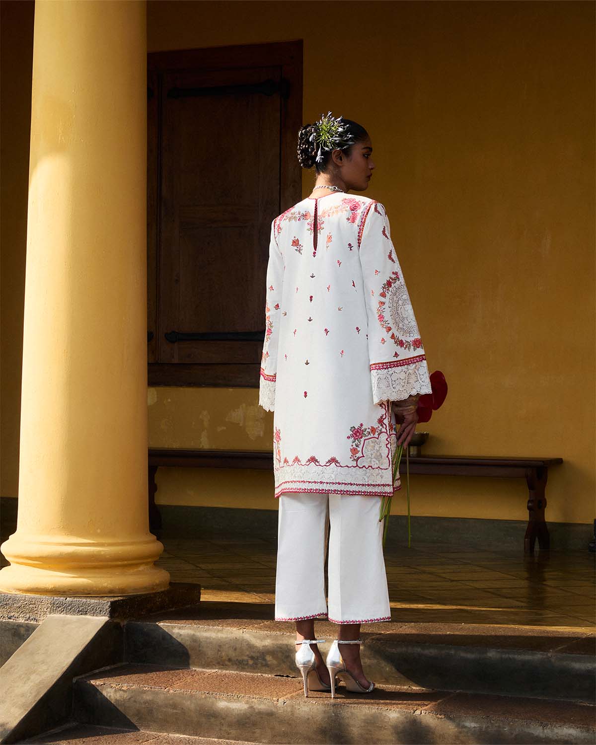 Description: A stunning blend of intricate embroidery and delicate textures, this ensemble is a true work of art. The ivory-colored short shirt is adorned with multicolor cross-stitch embroidery, creating a mesmerizing interplay of hues. Embroidered organza patches add an extra layer of depth and refinement, enhancing the overall aesthetic. The sleeves mirror this exquisite detailing, featuring matching cross-stitch embroidery and embroidered organza patches for a cohesive look. Paired with culottes featuring the same multicolor embroidery and embroidered organza patches, the outfit maintains a perfect balance of structure and embellishment. The detailed craftsmanship on the culottes adds dimension, making them a striking statement piece. Completing the ensemble is a green scarf, richly embroidered with multicolor cross-stitch motifs and finished with tassels for a touch of playfulness. Thoughtfully designed with intricate detailing, this look embodies elegance, tradition, and contemporary sophistication.