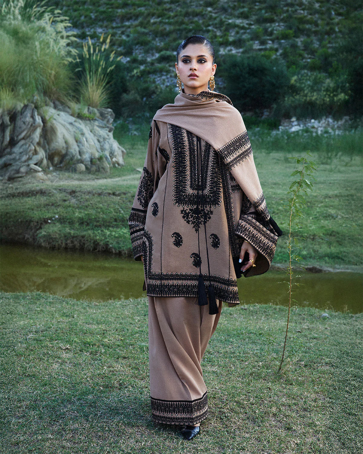 Description: This stunning beige outfit combines tradition with understated luxury. The shirt features meticulously placed monochrome *panni* embroidery across classic panels, creating a timeless aesthetic with intricate patterns. A tassel-tied neckline adds a hint of elegance and movement, while the embroidered bell sleeves with lace details lend a soft, refined touch. The matching beige shalwar is adorned with an embroidered border in traditional panni style, offering a cohesive look with a hint of heritage charm. Completing the ensemble is a coordinating beige scarf, finished with panni embroidery and delicate tassels. Designed to capture elegance in every detail, this ensemble is perfect for those who appreciate the beauty of traditional craftsmanship with a modern twist.