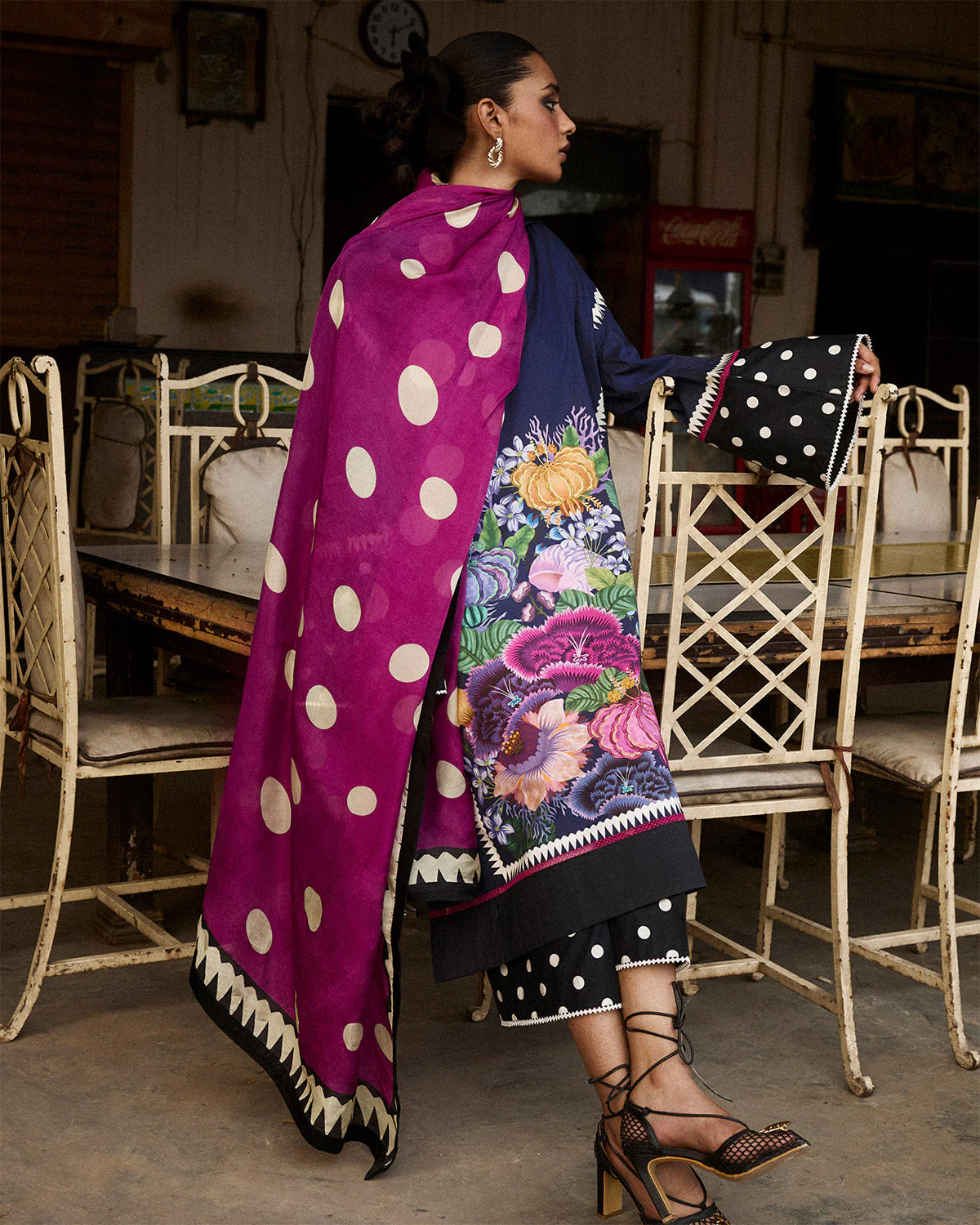 Description: "This outfit is a vibrant and playful combination featuring a coral printed oversized shirt with a unique one-piece collar, adorned with charming polka dot trims and details. The shirt’s bold coral print is contrasted by the subtle elegance of polka dots, adding a whimsical touch. Complementing the shirt are ivory culottes that feature a mix of prints and color-blocking, creating a dynamic yet balanced look. The ensemble is completed with a polka dot dupatta, which ties the outfit together with its coordinating pattern, adding an extra layer of flair and sophistication." .