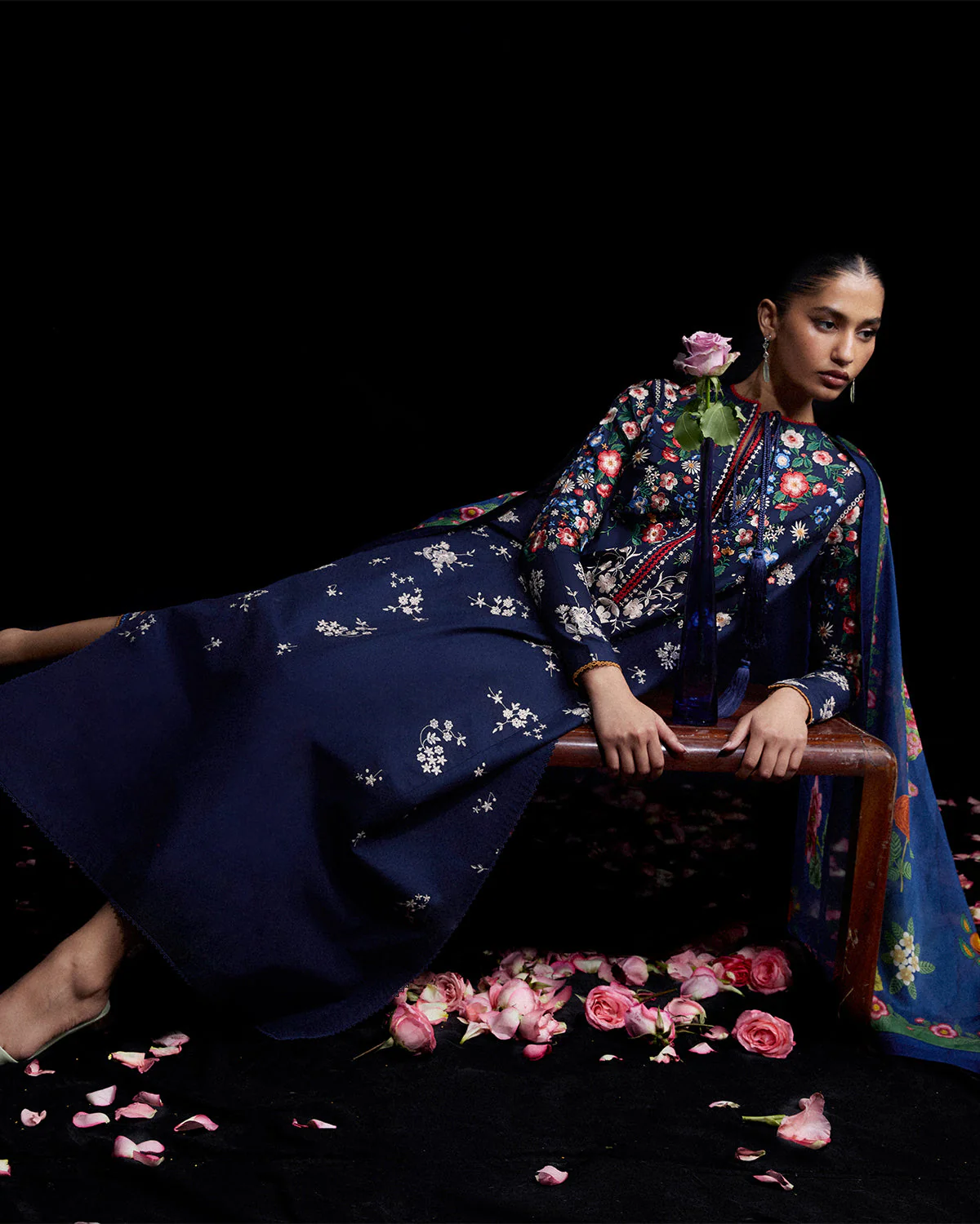 Description: Rich deep blue long shirt adorned with vibrant, intricate multicolor floral embroidery and delicate tassel-accented neckline, paired with fitted, detailed embroidered sleeves and matching culottes featuring a striking embroidered border. Completed with a flowing, luxurious digitally printed silk dupatta. Elegant, graceful, and timeless.