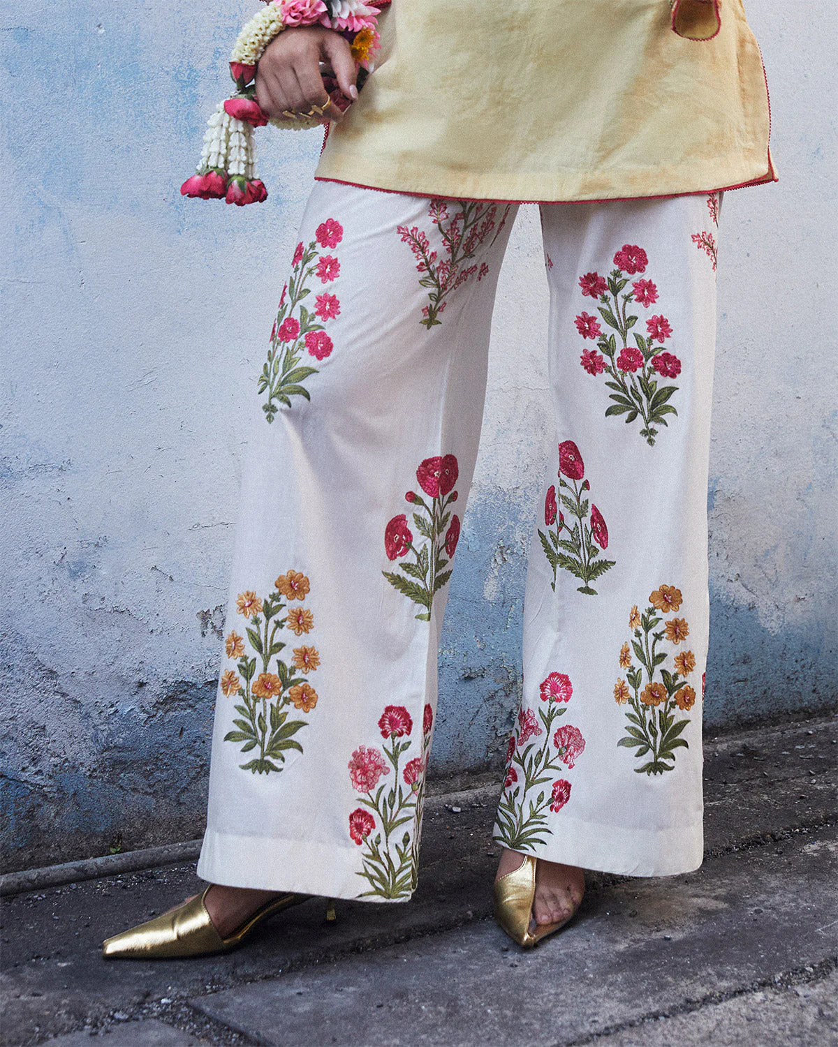 Product Description: A captivating ensemble that combines elegance with whimsical charm. Shirt crafted from jacquard fabric, the powder yellow short shirt features vibrant bell-shaped sleeves adorned with intricate multicolor embroidery, exuding sophistication. Paired with embroidered ivory cotton pants delicately embellished with floral motifs, this ensemble is perfect for any occasion, inviting you to indulge in moments of dreamy contemplation and timeless elegance.