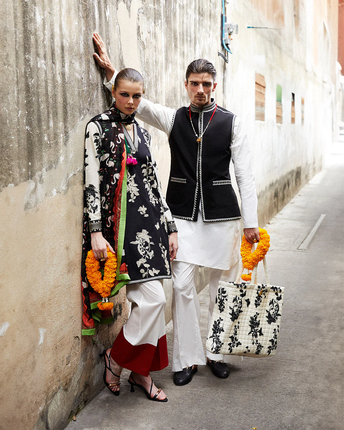 Product Description: A celestial blend of elegance and grace. Featuring a silk dupatta with a delicate swan print and satin silk hemming, paired with a black cotton shirt adorned with ivory floral embroidery and ivory sleeves with intricate black embroidery. Completed with ivory trousers featuring a bold red color block patch, this ensemble exudes sophistication with a modern edge.