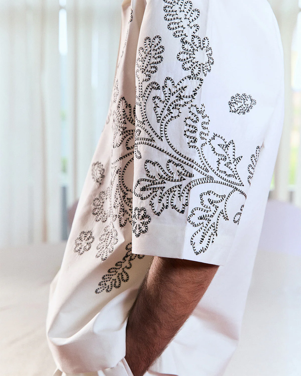 Description: This ivory set is defined by its quiet elegance. The shirt features monochrome linear embroidery, offering subtle texture and a sense of structure. It's paired with a dyed, relaxed-fit trouser in the same tone, keeping the silhouette soft and effortless. A minimal statement with timeless appeal.