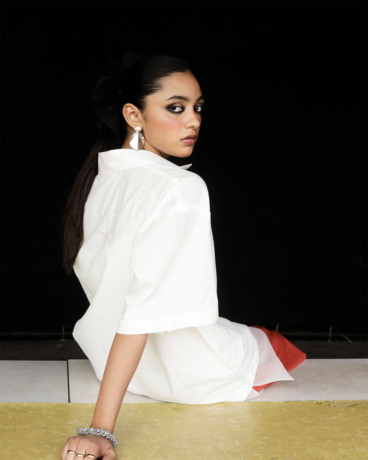 Description: Embrace understated elegance with this refined ivory ensemble. The V-neck collared shirt features a delicate organza hem, adding a touch of ethereal sophistication to its classic design. Short sleeves keep it effortlessly chic, while black floral embroidery on the side front introduces a striking contrast and intricate detail. Paired with vibrant coral culottes, this outfit harmonizes the soft ivory and bold coral tones, creating a balanced and stylish look that's perfect for both professional and casual settings..